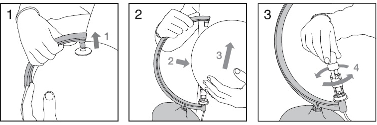 Bei einem Globus mit Metallmeridian muss die Arretierung am Nordpol (Schraube, Stift etc.) gelöst werden. Eventuell nehmen Sie einen kleinen Schraubendreher zu Hilfe. Danach kann die Kugel zur Seite gekippt und vorsichtig von der Fassung am Südpol abgehoben werden. Dabei darauf achten, nicht mit dem Meridian an der Kugel zu kratzen.
